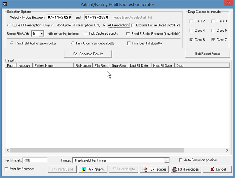 Although you could also select F6 - Patients or F9 - Prescribers to generate refill requests, we are using F8 - Facilities in this example.