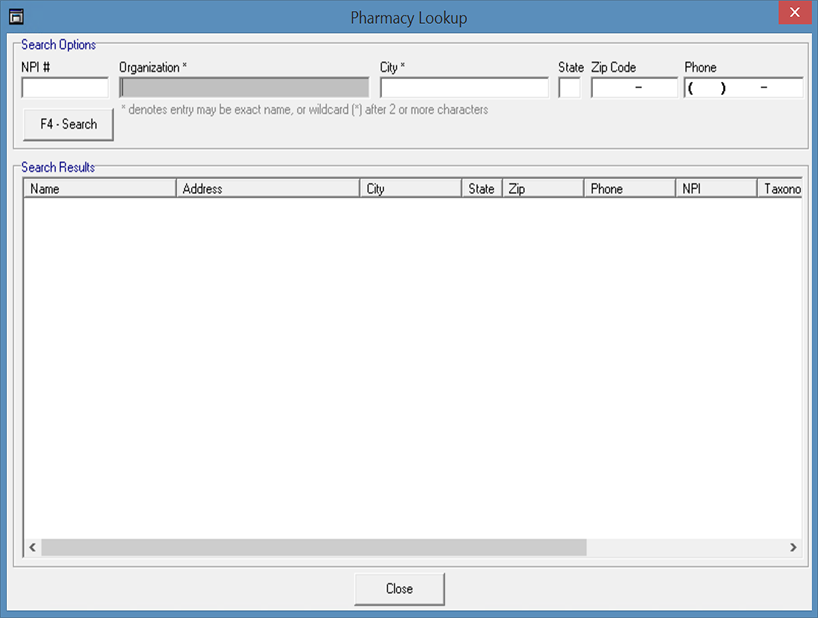 While searching for a pharmacy, you have to include either an Organization or City for the lookup to find any results.